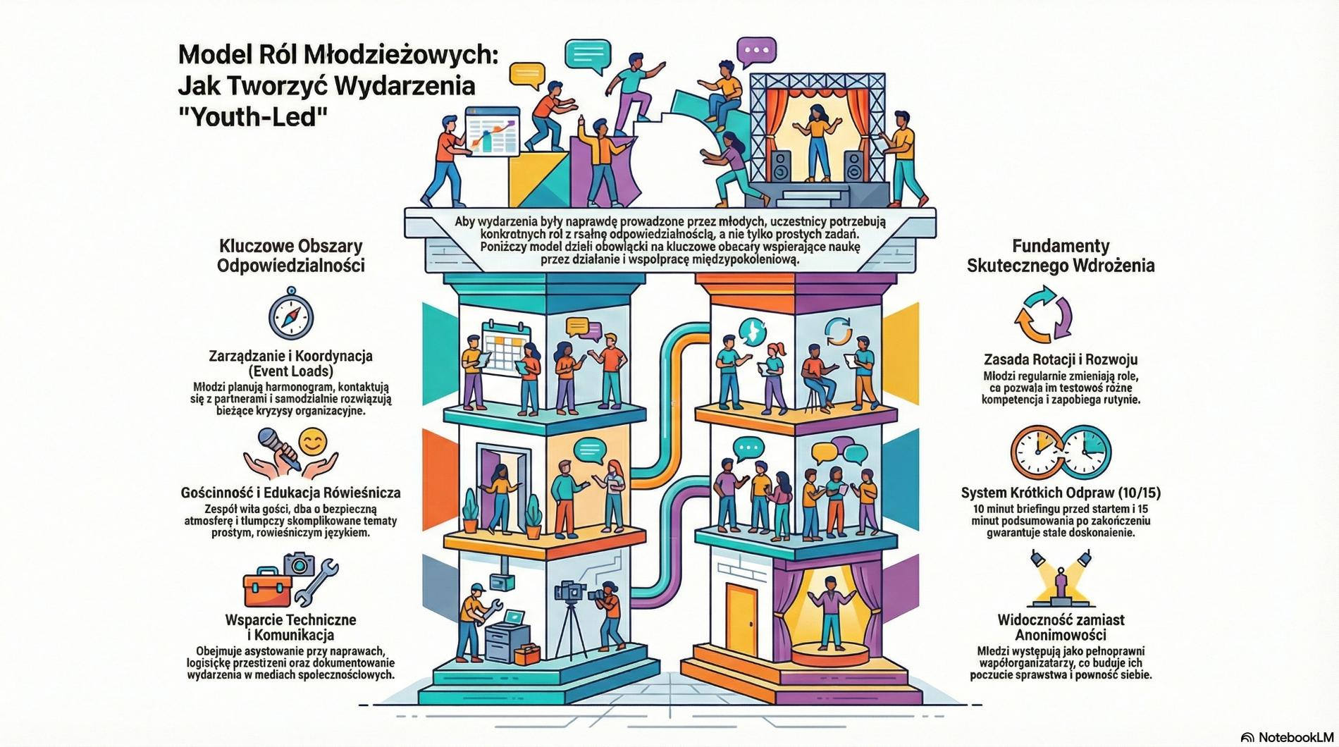 Zespół Repair Ambassadors pilnuje zasad i scenariusza, a Media/Storytelling przygotowuje komunikaty i grafiki bez elementów politycznych. Dzięki temu młodzi realnie chronią neutralność i zaufanie do youth space.