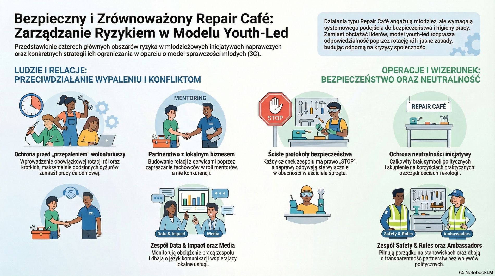 Działania typu Repair Cafe i inicjatywy „Right to Repair” w youth space są bardzo angażujące, ale niosą też konkretne ryzyka. Kluczowe jest to, żeby nie „zrzucać” ich obsługi na 1-2 najbardziej aktywne osoby, tylko od początku budować system ról, zasad i partnerstw, w którym młodzież ma sprawczość, a jednocześnie działa w bezpiecznych ramach. Poniżej opisujemy cztery najczęstsze ryzyka i sposoby ich ograniczania - w modelu youth-led.