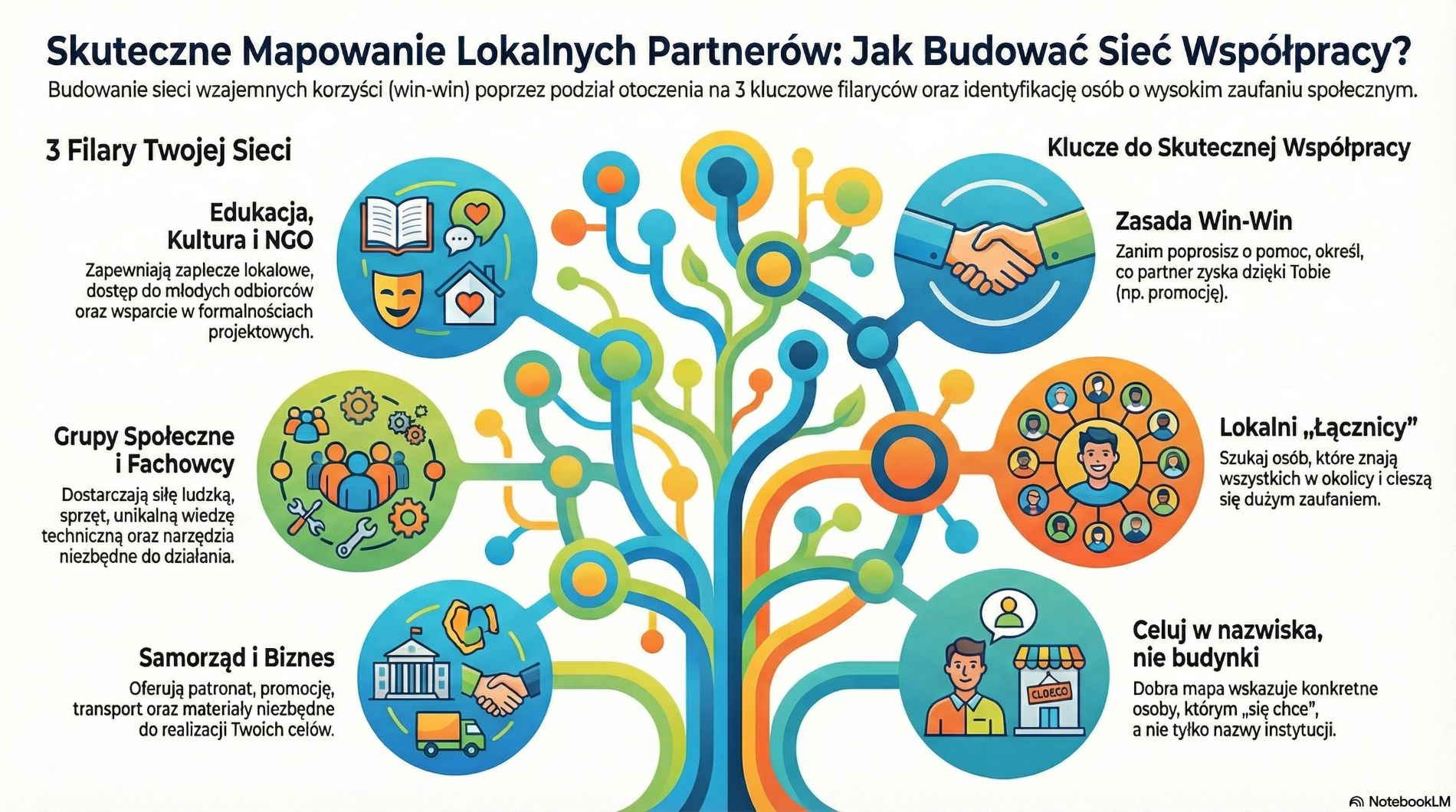 Moja rada: Szukaj lokalnych „łączników” - osób, które znają wszystkich i cieszą się zaufaniem. Pamiętaj o zasadzie win-win: zanim poprosisz o pomoc, zastanów się, co partner zyska dzięki Tobie (np. darmową reklamę lub realizację celów społecznych). Dobra mapa to nie tylko nazwa budynku, ale konkretne nazwisko osoby, której „się chce”.